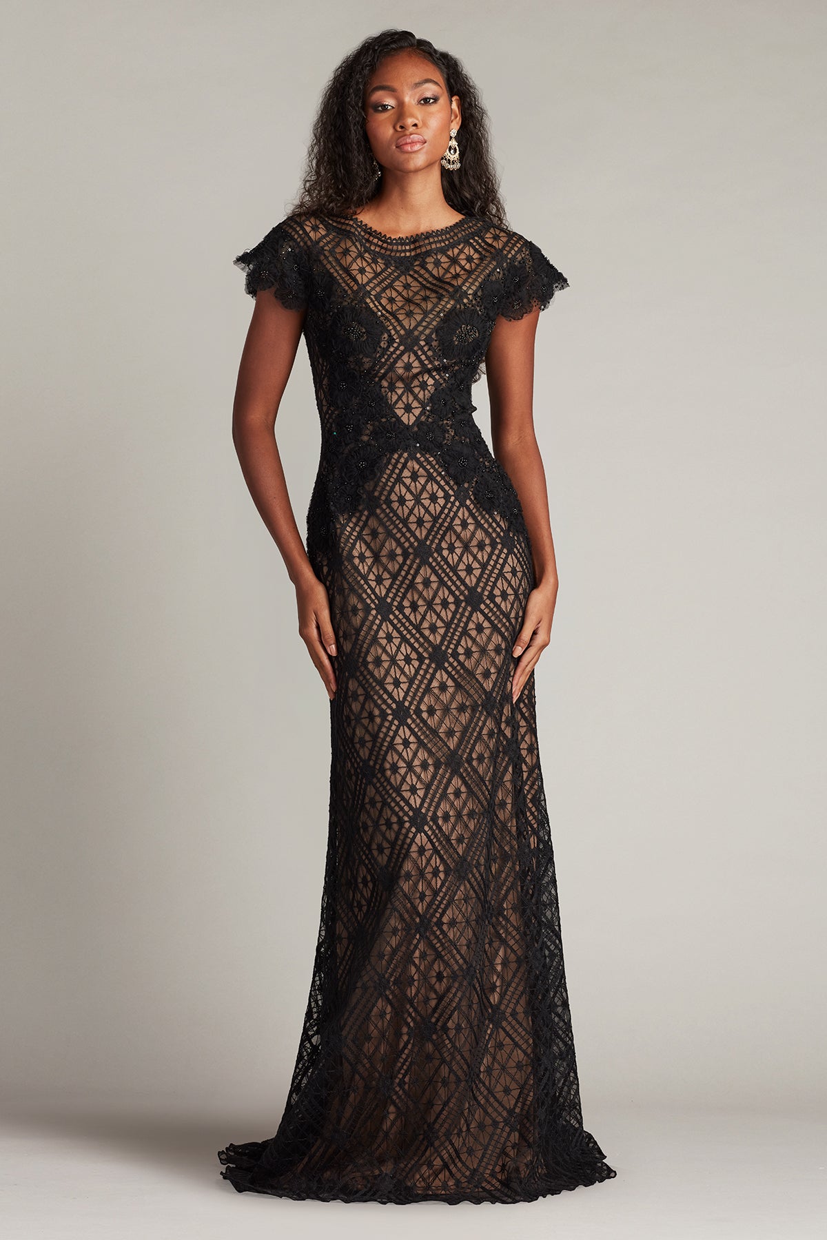 This stunning gown is an elegant and sophisticated choice for any evening or formal occasion. Featuring a graceful illusion neckline and delicate ruffled cap sleeves, it is beautifully crafted from mesh and adorned with corded embroidery. The embroidery artfully frames the sides of the bodice, creating a flattering silhouette that enhances the figure. With its flawless fit and refined length, this dress offers timeless luxury and is a must-have for any special event. Center back invisible zipper. Lined.