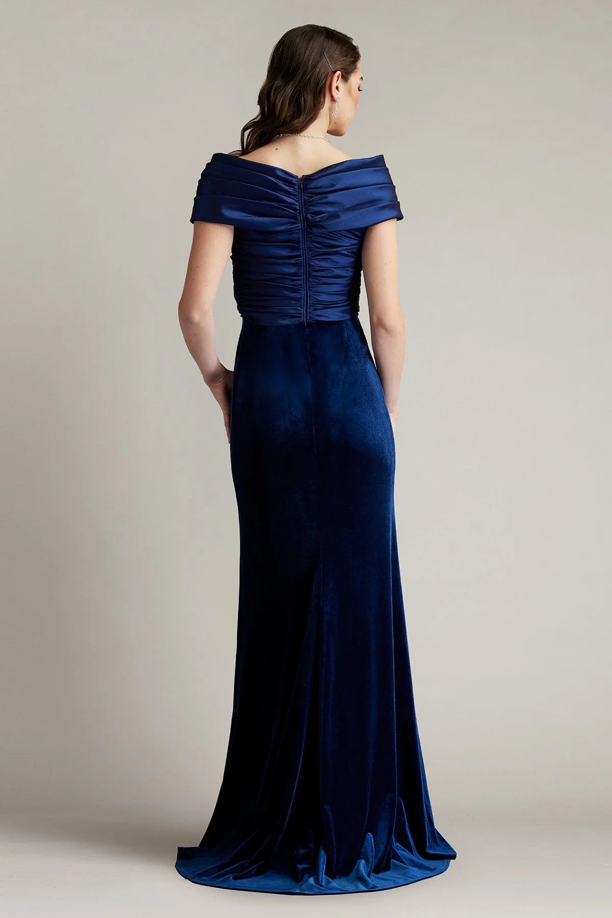 Crafted in luxurious velvet with a touch of taffeta, this floor-length sheath features an off-shoulder V-neckline and a pleated crisscross bodice that flatters the figure. The empire waistline adds elegance, while a thigh-high slit brings modern allure and ease of movement. Finished with a concealed back zipper, this gown is perfect for formal events, galas, or black-tie occasions.